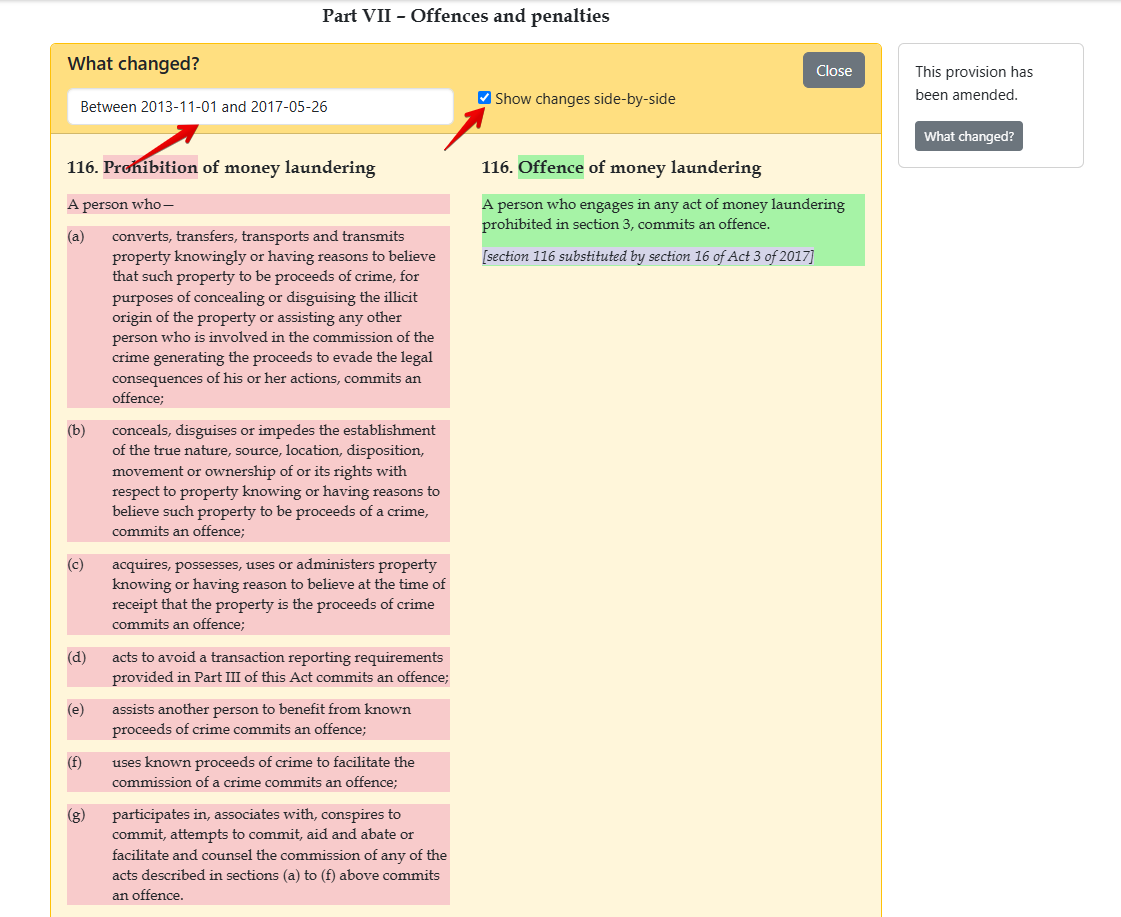 * When viewing the provision side-by-side; the left-hand side is the **previous version** and the **amended version** is displayed on the right-hand side.